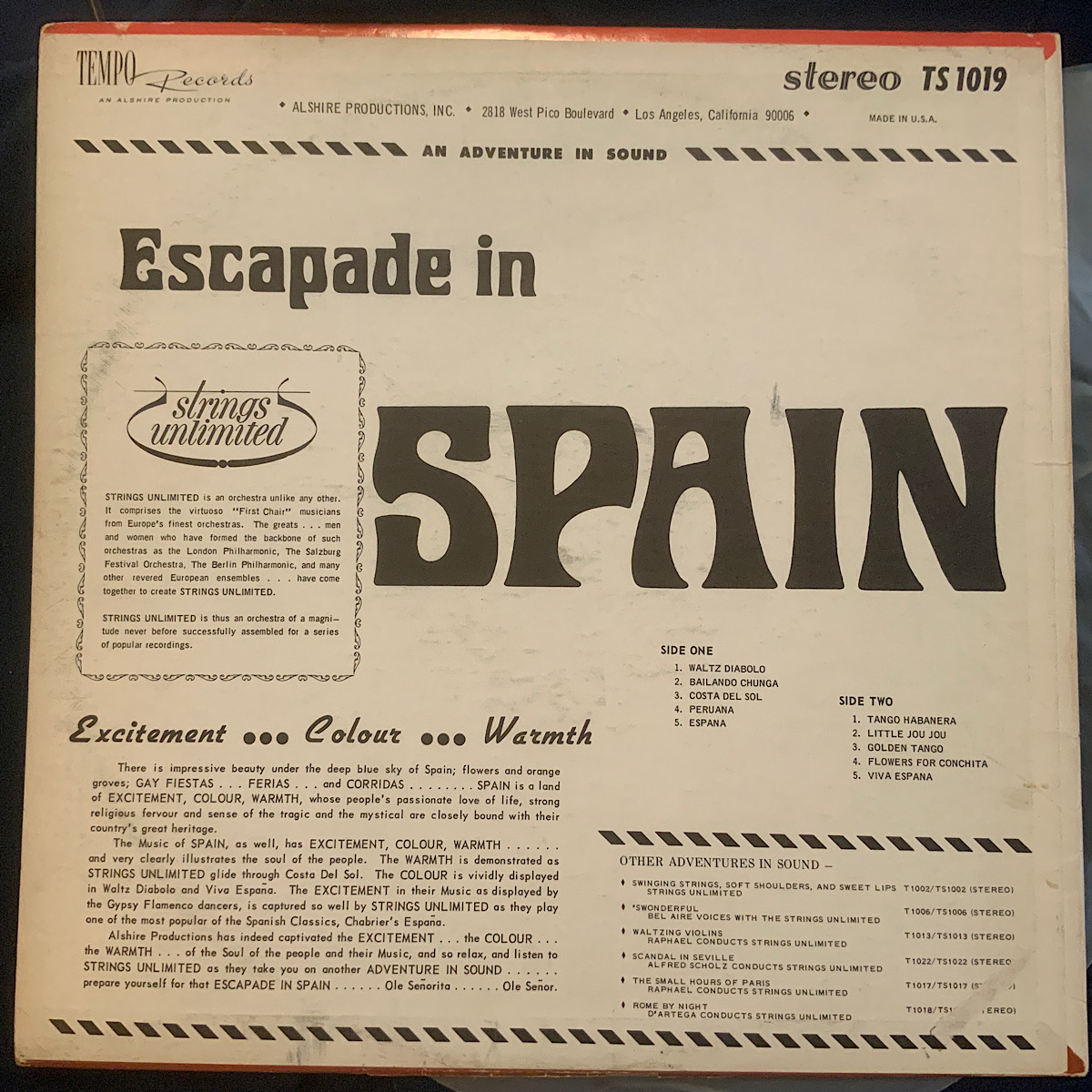 For a while, I thought there were three LPs from Tempo that featured Mozart Edition cues, being TS 1013, TS 1017 and TS/T 1021, but I was pleasantly surprised to see that this is a fourth LP from Tempo with Mozart cues, especially for the fact that the PDF I saw this LP in showed a tracklist from a similar LP from Oscar Records that doesn't feature Mozart Edition cues, but does share the same cover art. That Oscar Records LP was an LP named "The Fire And Romance Of Spain". The Tempo LP's tracklist is different than the Oscar LP, as it contains even more rare Mozart Edition cues, mainly from (As usual) Peter Walden's Orchestra Raphaele, the usual orchestra in Mozart Edition's catalog. There are some interesting things worth noting about this LP. Firstly, Costa Del Sol by Werner Bochmann on this LP is shortened, as the beginning of the track is cut off. Thankfully, this track had been archived on one of Mozart Edition's CD re-issues, specifically MECD.1005. Secondly, this is another Tempo LP to feature a Raphaele Concert Orchestra arrangement by Peter Waldenmaier, the orchestra's main conductor, this time being Emmanuel Chabrier's "Espana", which was originally written by Chabrier in 1883 after a trip of his to Spain, and was also dedicated to Charles Lamoureux, who conducted this piece's first public perfomance on November 4th, 1883. Lastly, and most interestingly, Flowers For Conchita by Chris Striegler is a cue that's likely played by none other than Detlef Rath and his Orchestra, specifically a cue from the orchestra's later tracks in Mozart Edition, as this contains similar instrumentation to a cue I compared this to, Alexandria by Ralf Heninger, also from the same orchestra, but credited as Orchestra Raphaele on its LP issue on ME.LP 045. Rath also conducted a few other pieces on ME.LP 45, including "Let's Change" by Karl Faust (An alias for Rath himself) and "Goodbye Rio" by Rudolf Maluck. This is a notable piece on this LP, because outside of background music records and tapes from things like 3M Cantata, Customusic and Seeburg, this seems to be the only Detlef Rath piece to surface on a non-library issue that I've seen. This track also may have gotten a Radio Records issue on RRS 110 - Magic Brazil, where the cue was possibly renamed to "Newcastle Retreat", though I do not have this LP in my collection, so I can't confirm it. Also note that Flowers For Conchita on this LP is in mono, compared to the rest of the cues on this LP, similar to the Jack Dieval cues from TS 1017, Champs Elysees Promenade and Place Vendome. Here's the LP. I also provided a file for the full version of Costa Del Sol in this rip too. Special thanks goes to Kevin Stapylton for the full version of Costa Del Sol. Enjoy! =)