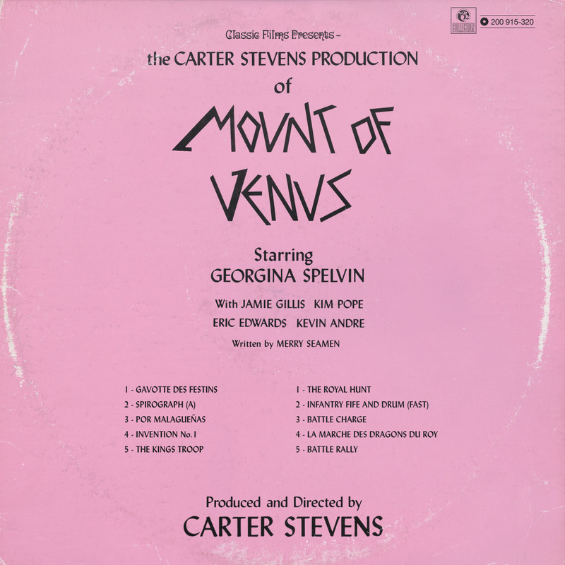 Mount Of Venus, another Carter Stevens production released in 1975, music composed by John Leach, Roger Roger and Ron Geesin from KPM Music, also using two «royal» french classical music composed by A.D. Philidor and orchestred for those versions by Pierre Bréard and Jean-Francois Paillard, and one latin mariachi music composed by Emilio "El Moro" & Juan Telleria
