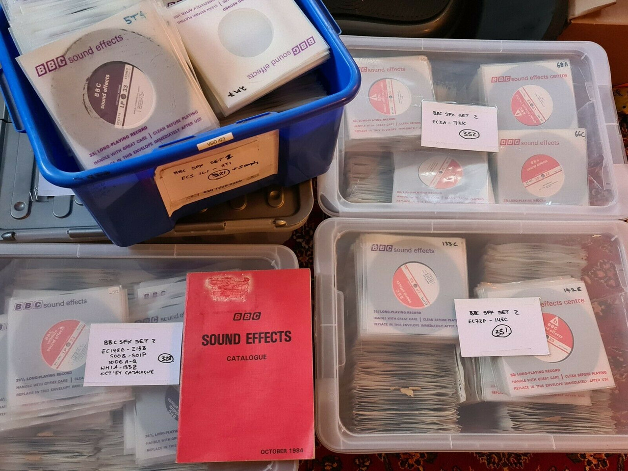 The Recorded Programmes Library also maintained an extensive collection of sound effects on 78 rpm discs. No catalogues for this range are known to be in the public domain; none exist at the BBC Written Archives Centre, there none are at the British Library, none are known to have sold on eBay.